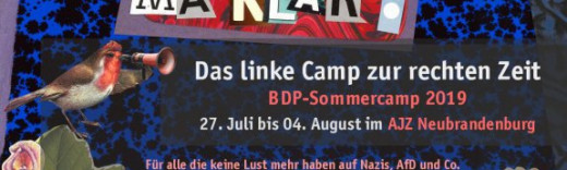 Angesichts der aktuellen Weltlage kann es für unser BDP Sommercamp 2017 nur ein Motto geben: Komm ma‘ klar! Daher treffen wir uns zum bundesweiten BDP Sommercamp vom 27. Juli bis 04. August 2019 im AJZ Neubrandenburg in Mecklenburg-Vorpommern.